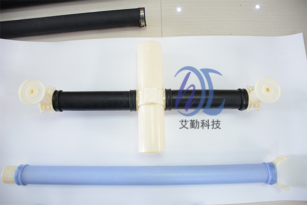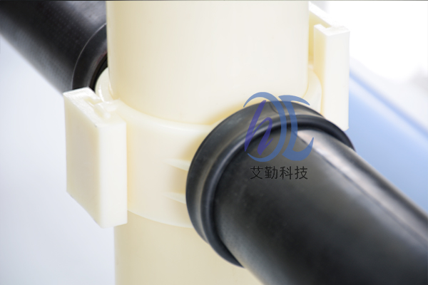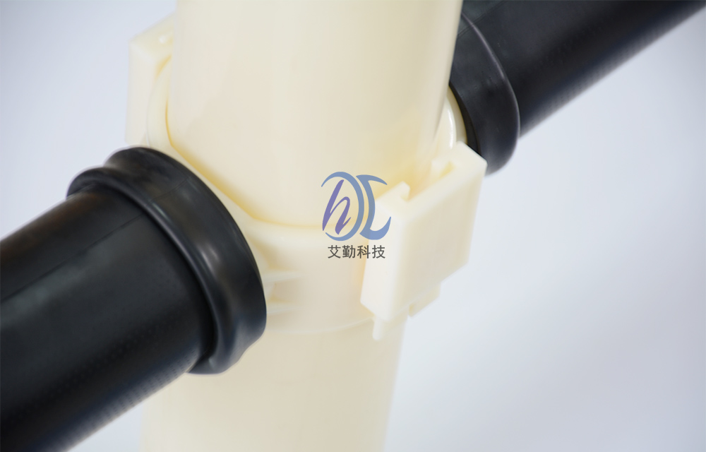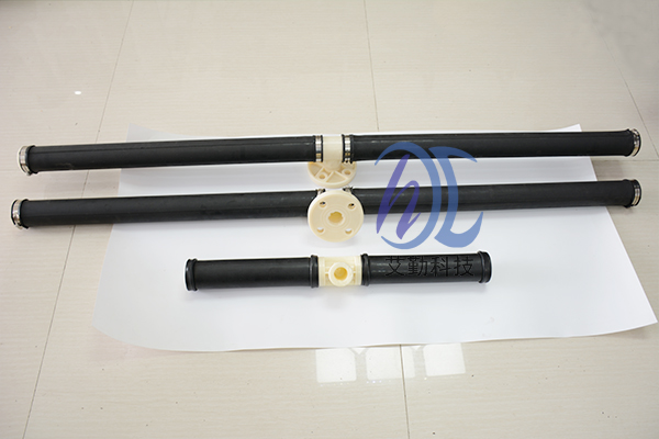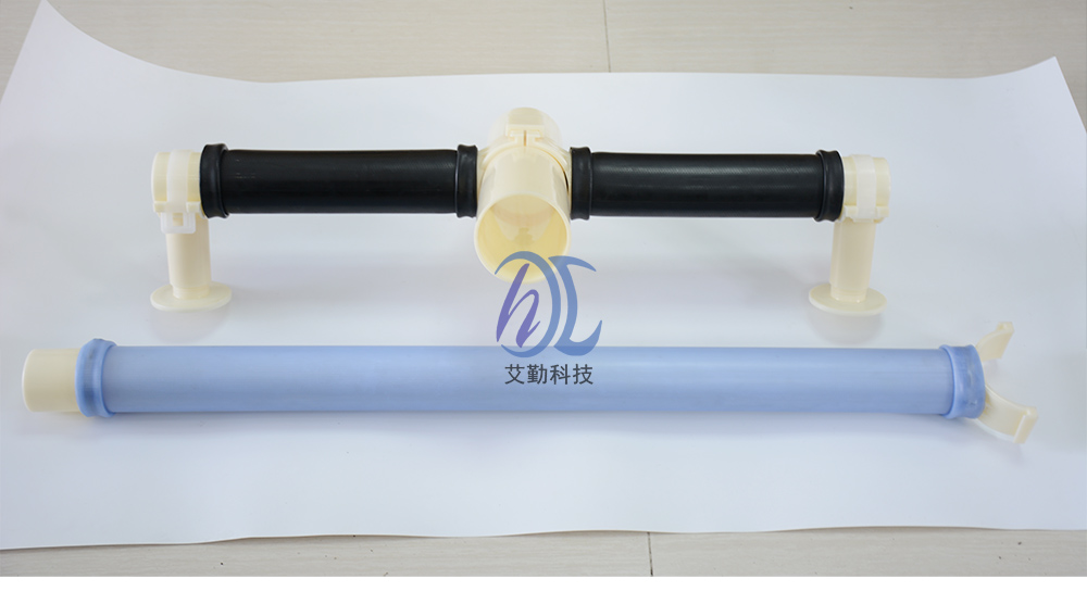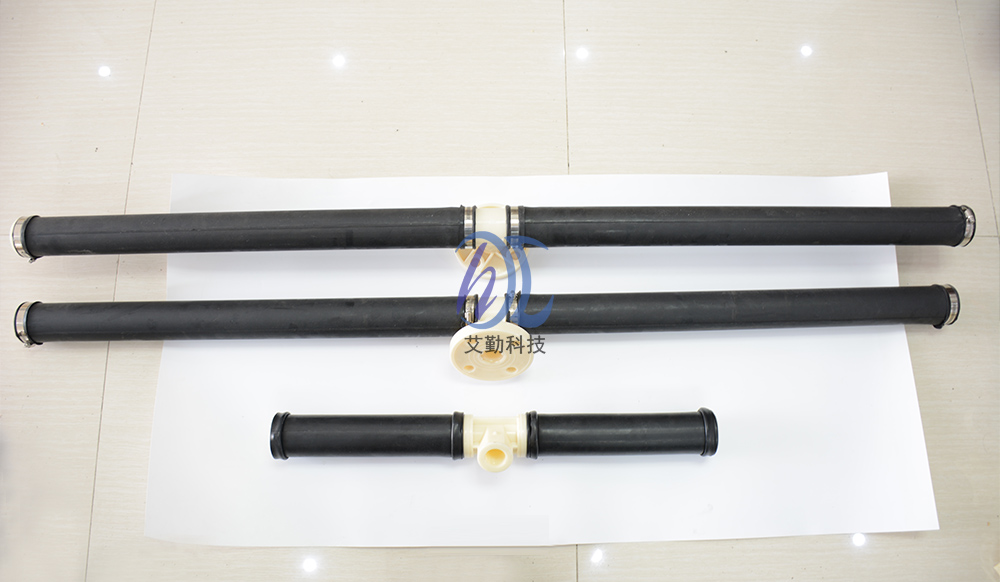 管式微孔曝气器与布气支管的连接方式应为“鞍形卡套式插板坚固型”,并在进气接咀处配有O形橡胶密封圈。 为了确保曝气膜片有足够长的使用寿命并降低运行阻力,特别要求:薄膜管式微孔曝气器内衬管的布气孔要求沿内衬管长度方向均匀多点分布(斜向下交叉开孔)。 该系列曝气管的支撑衬管实质类似于一根穿孔管,因为它与穿孔管一也是斜45度朝下开孔的,然后外表面再套上橡胶膜,这样的设计可防止膜片寿命达到极限后一旦破损也不会产生很大的气泡而影响其它管路曝气器,因为膜片破损后它就以穿孔管的形式进行充氧曝气,对系统并无致命性危险!